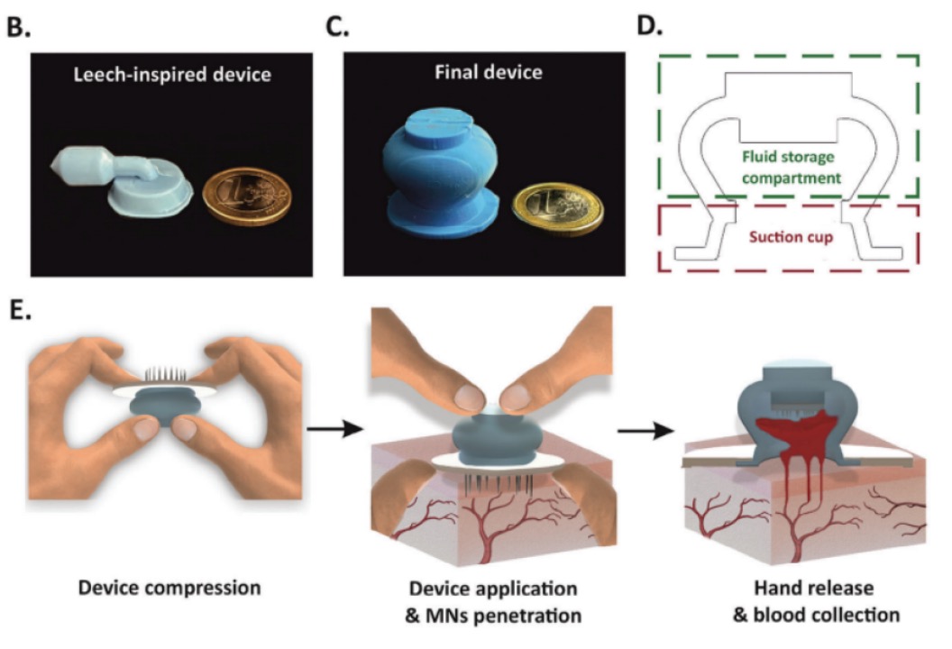 By studying leeches, it was discovered that they attach to their host with a suction cup. The researchers realized that a similar system could be developed to collect blood. After attaching, leeches pierce the host’s skin with their teeth. To draw blood from the wound, they generate a vacuum by sucking. The working principle of the new device is very similar: a suction cup about two and a half centimeters in diameter is fixed onto the patient’s upper arm or back. Inside the cup, there are twelve microneedles that pierce the skin when pressed onto it. Within a few minutes, the vacuum in the suction cup ensures sufficient blood is collected for diagnostic tests.
